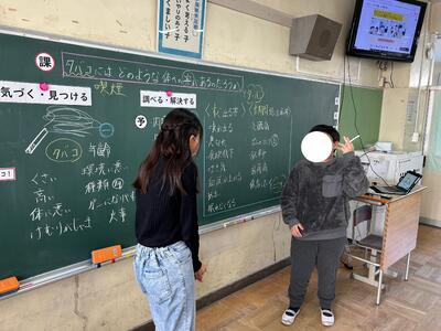 今日は喫煙の害と健康についての授業です。喫煙について良いイメージをもっている児童は少なく、課題を見つけていきました。