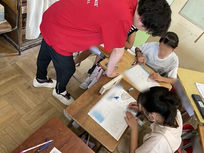 図工「季節を感じて」では、学校の周辺を見て回り、自分の感じた季節を、表したいイメージに合った方法で絵に表す学習です。